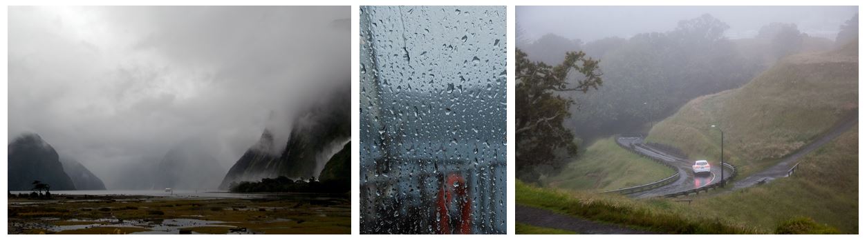 Image source left to right: Milford Sound (user BriYYZ, Wiki Commons); Rainy Window (user missbossy, CC2.0); MT Eden (user russellstreet, CC2.0)